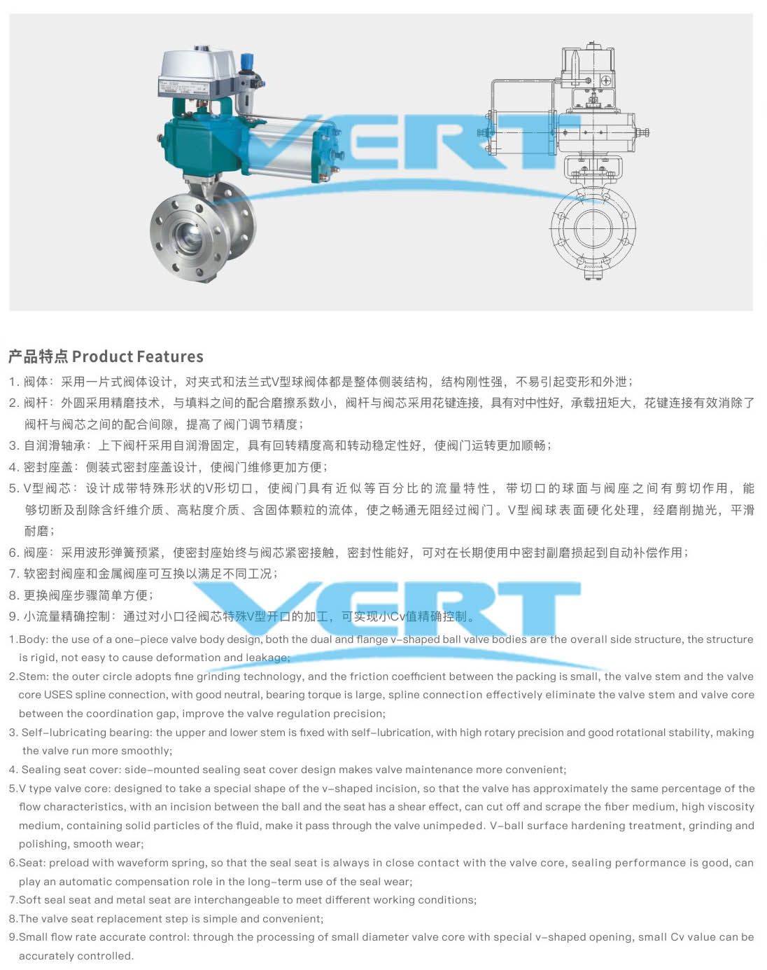 Of V-type regulating ball valve is a kind of ball valve, it shutdown a is half sphere has aV opening, v-shaped opening has a sharp edge, in the process of rotating sphere, wiping, between the closed to the media has a strong cutting force, the sphere of the v-shaped opening port to form a fan-shaped area, with the valve seat can change the port area, in the process of rotary forming of medium precision adjustment, it is a kind of Angle of rotation of the regulator, the same as the common ball valve sealing, make it have a combination of regulation and switch two functions, equipped with pneumatic or electric actuators, widely used in industrial process control system.